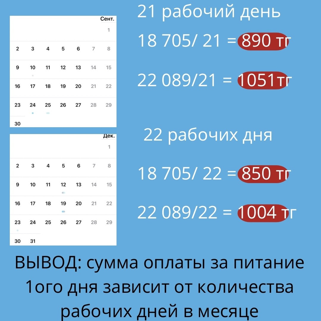 Бір айдағы төлем сомасы жұмыс күндерінің санына бөлінеді. Осылайша, тәулігіне сома жұмыс күндерінің санына байланысты.